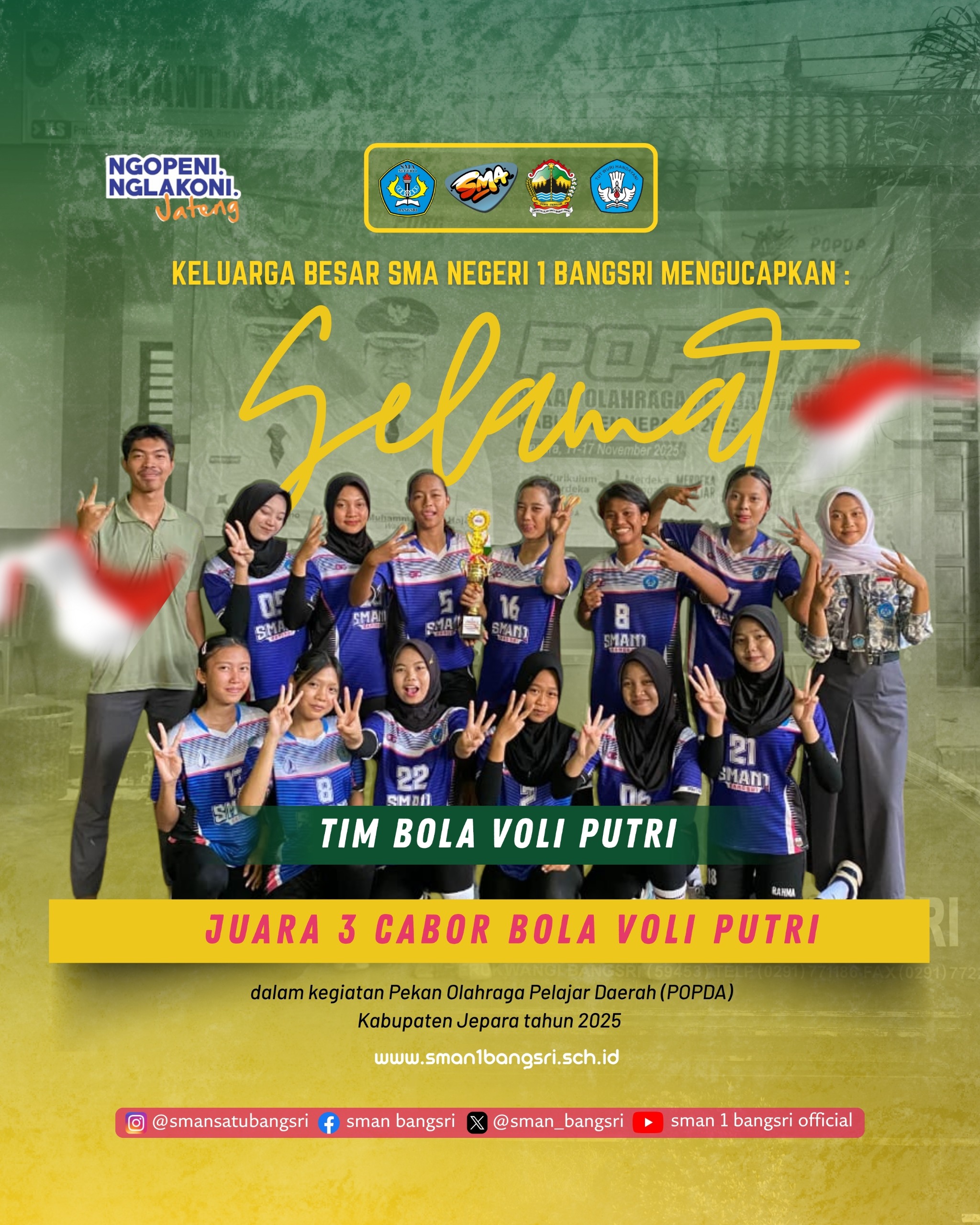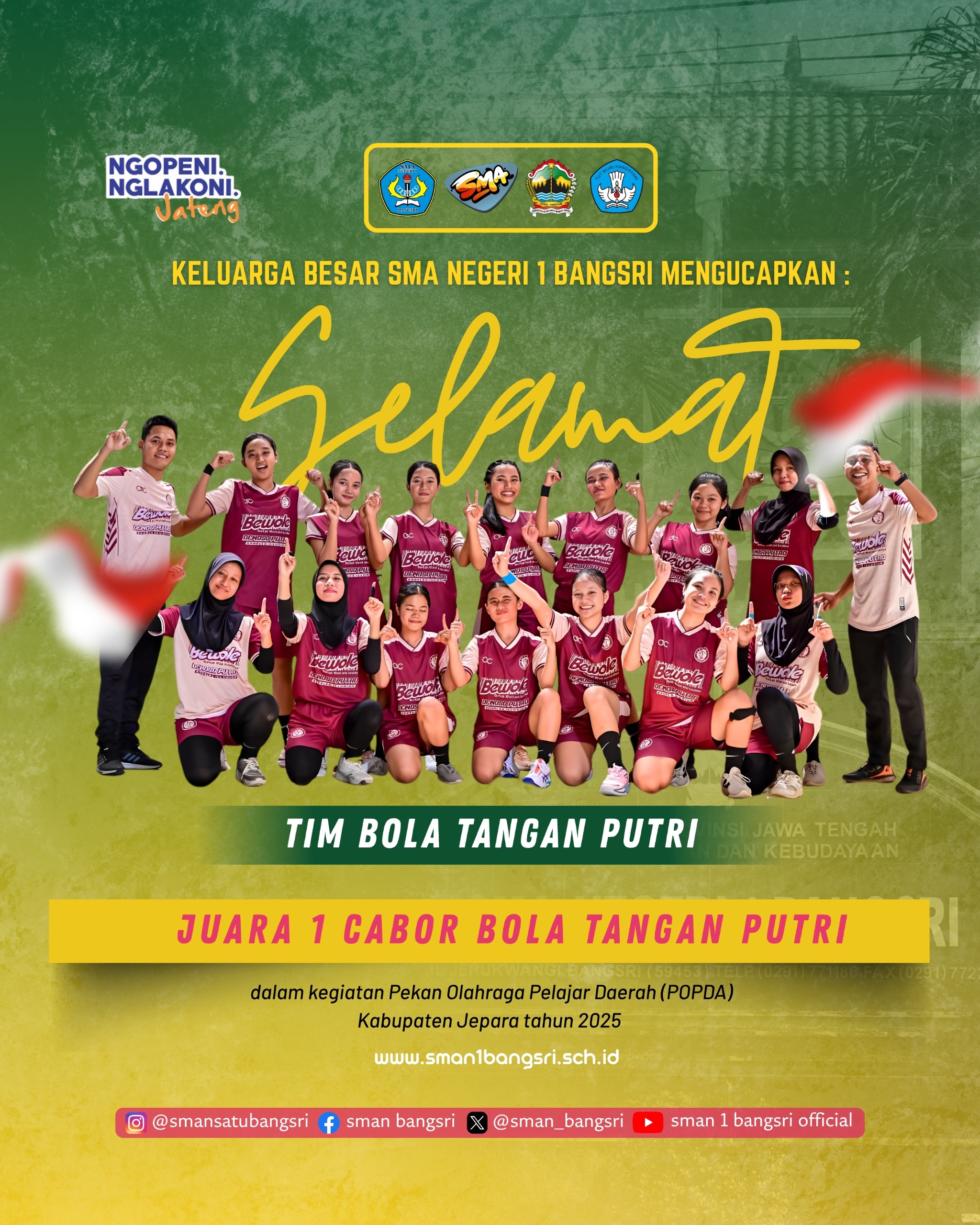 Puji syukur kepada Allah SWT, Tuhan Yang Maha Esa yang telah memberikan rahmat dan anugerah-Nya sehingga peluncuran website baru SMA Negeri 1 Bangsri ini dapat dipublikasikan. Salah satu tujuan dari website ini adalah untuk menjawab akan setiap kebutuhan informasi dengan memanfaatkan sarana teknologi informasi yang ada.